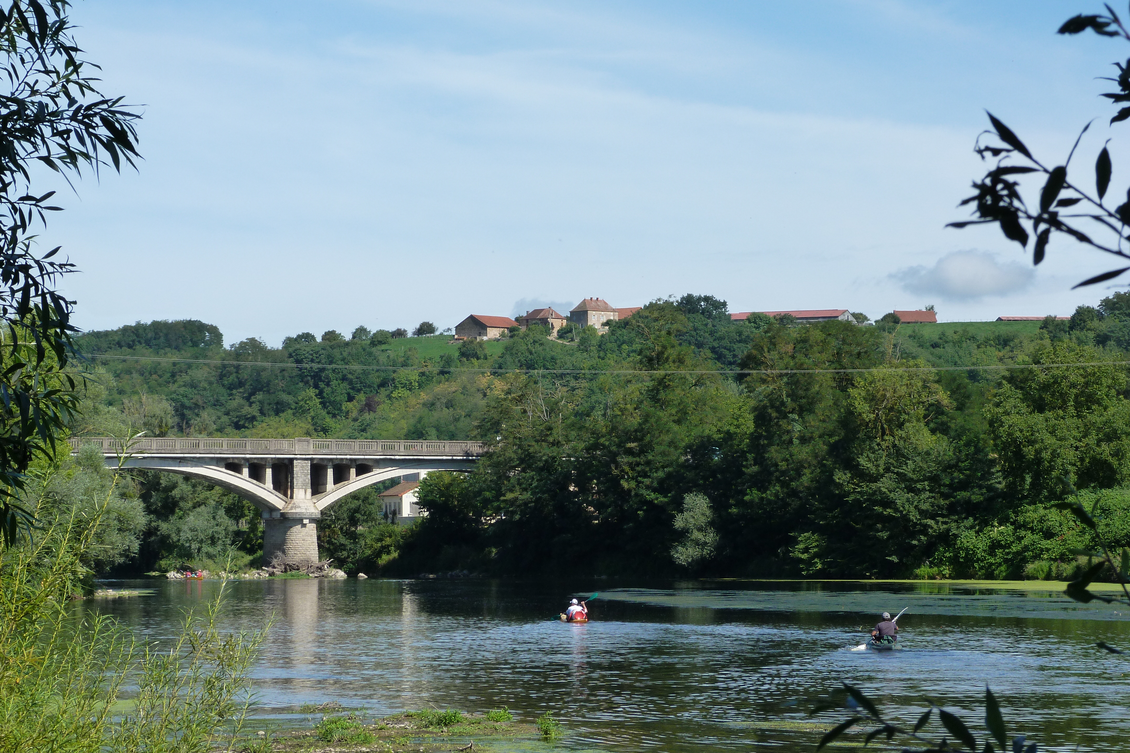 On Saturday, we got up early to put the finishing touches on a picnic (little sausages, a cooked chicken, breads, melons, tomatoes, wine, coffee and left over birthday torte) and went to rendezvous with 15 of Peta and Bryan’s friends near Marcigny beside the Loire river. A canoe rental business is housed in an old stone house, with immaculate patio, beside a huge old barn. The barn is filled with life jackets, bidot (plastic bins to put our belongings in) and all manner of plastic canoes, kayaks and paddles. We all climb into a small bus, pulling a stack of canoes & kayaks, and are driven 10 kilometers up river where we re-grouped, only to find that we were 1 canoe short.