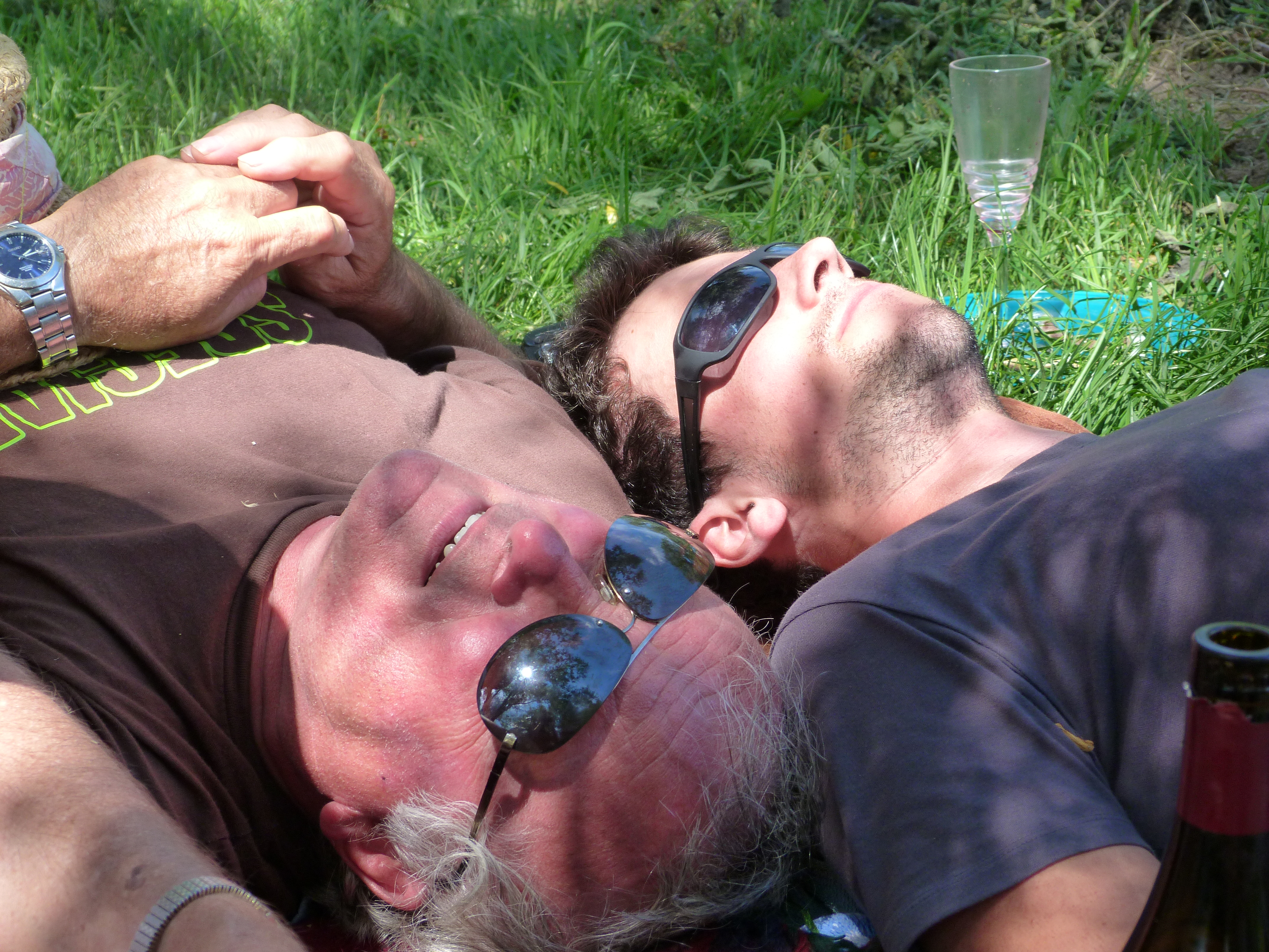 All food and drink is shared. But the way it is shared is that you put some of what you have brought on your own plate and then carry the rest of it around to each cluster of people, offering them little bits. The same is done with the wine, beginning with the white, moving to the rose, and finishing with the red. Different reds for different parts of the meal. Christian brings us some exquisite chèvre, but is dismayed that we only have Bourgogne to drink with it. He returns with a half bottle of Cote du Rhône, insisting that we keep it for the chèvre.