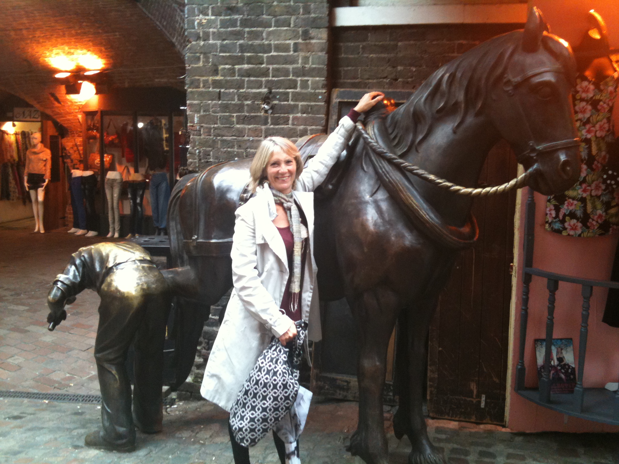 Amanda with a bronze work horse of Camden Town, shod by a bronze blacksmith