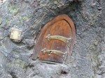 It takes us a leisurely 40 minutes, and as we come toward the bridge we see a beautiful tiny wooden door set in a tree.