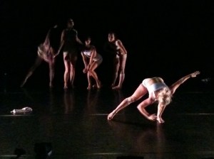 “Body of Work” explores body issues and body politics. It is a 60-minute piece with five dancers of very different body types. They work together and separately to question how we relate to our bodies. The music ranges from a kind of African drum base to synthetic scratching, but one of the most striking sections uses the song “Will You Still Love Me Tomorrow”. A dancer breaks off to dance a fearful and passionate response to the song. The other four dancers each take a corner of the stage and begin to draw on themselves with lipstick. You realize that the drawings are marks for a plastic surgeon – a circle and an X on the thigh; a nip and tuck of the stomach. The question in the song becomes: “Do I have to change myself for you to still love me, tomorrow?”