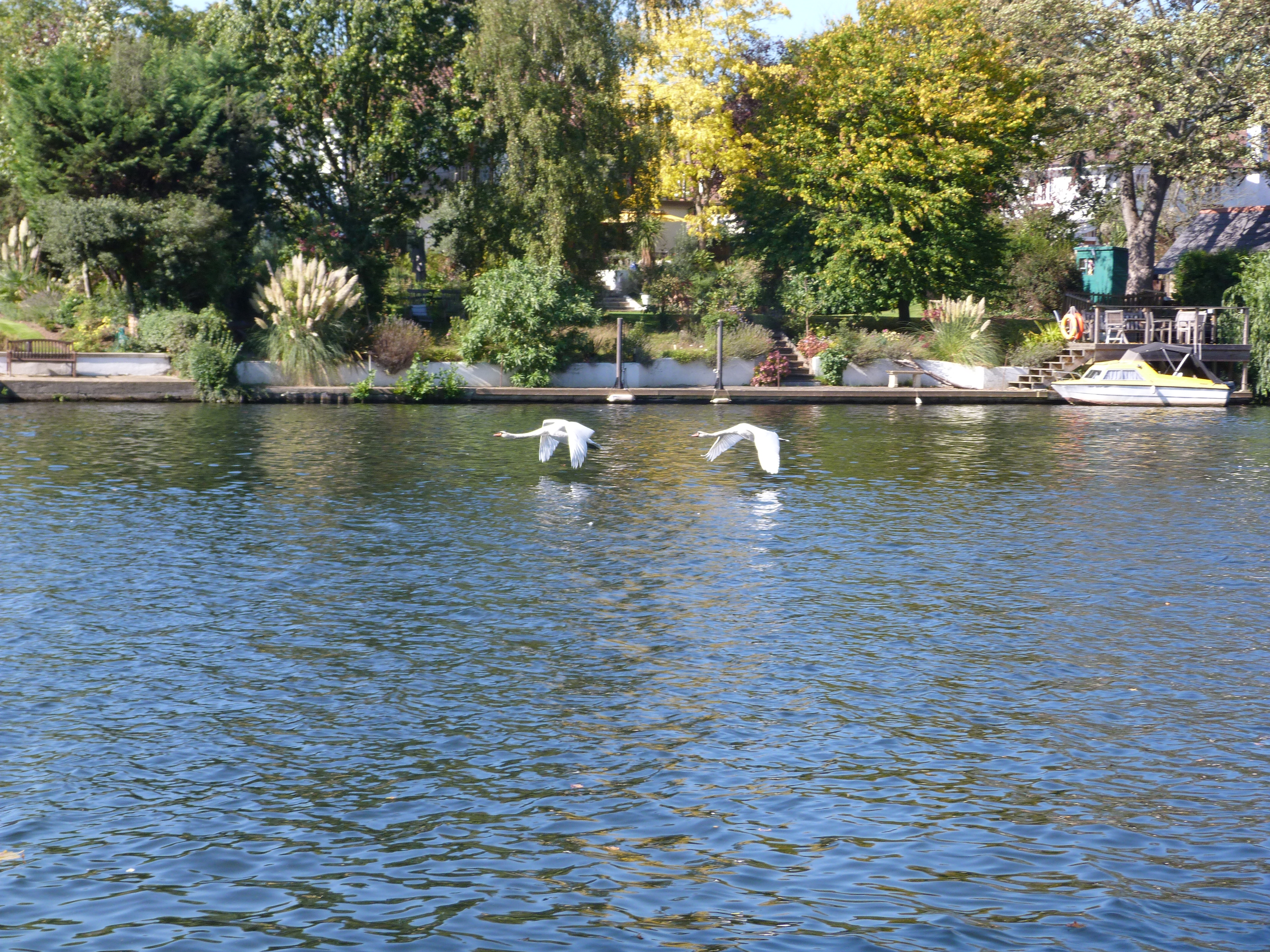 A few lazy canoes, kayaks and rowboats. A canal boat. A small motor boat. A tourist boat. Everything and everybody was moving slowly, gracefully. The swans glided by, occasionally rousing themselves to fly 50 yards up stream in the hopes of better eating. When swans fly they only barely rise out of the surface of the water, and they paddle their feet on the surface as though they are trying to get some traction from the water.