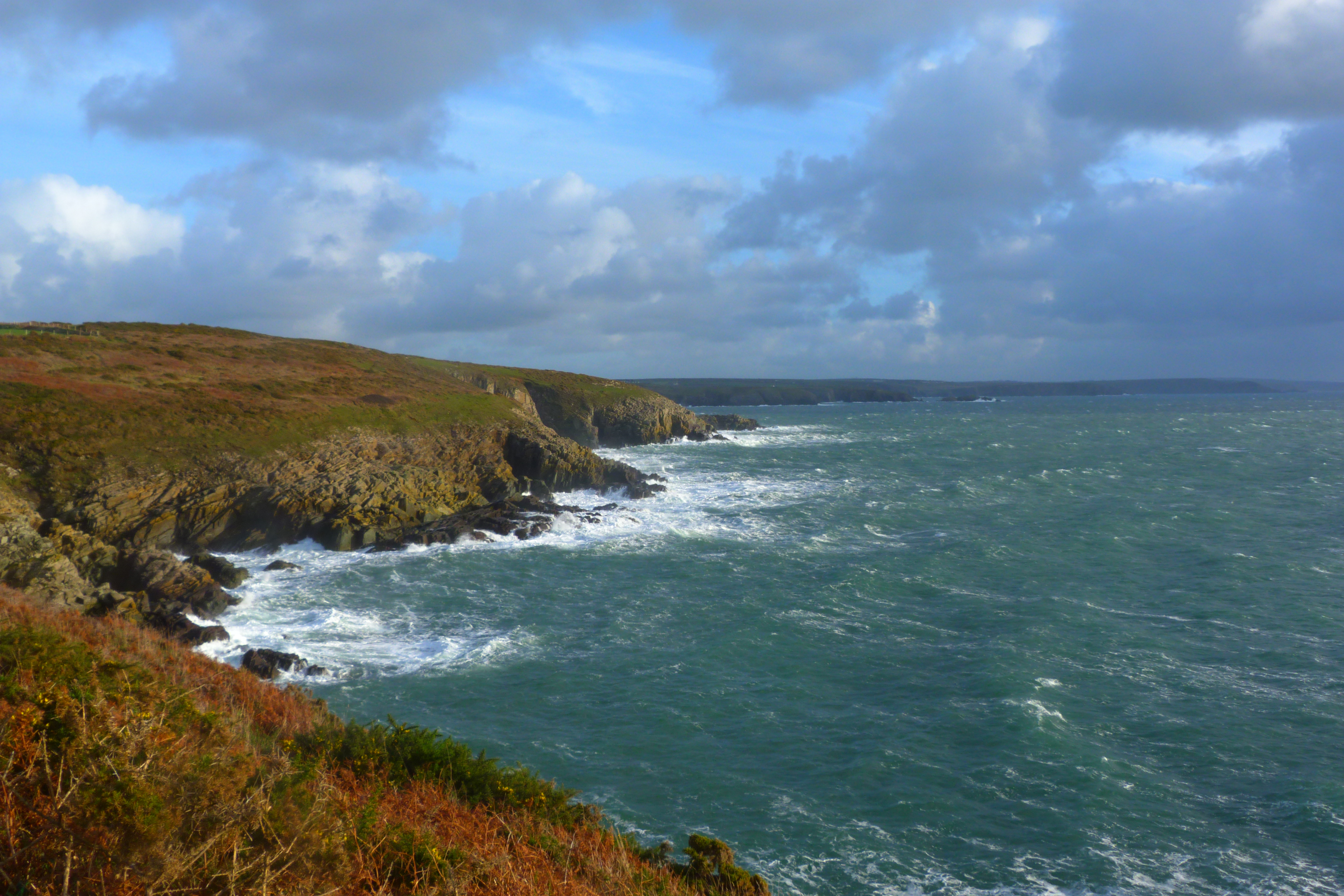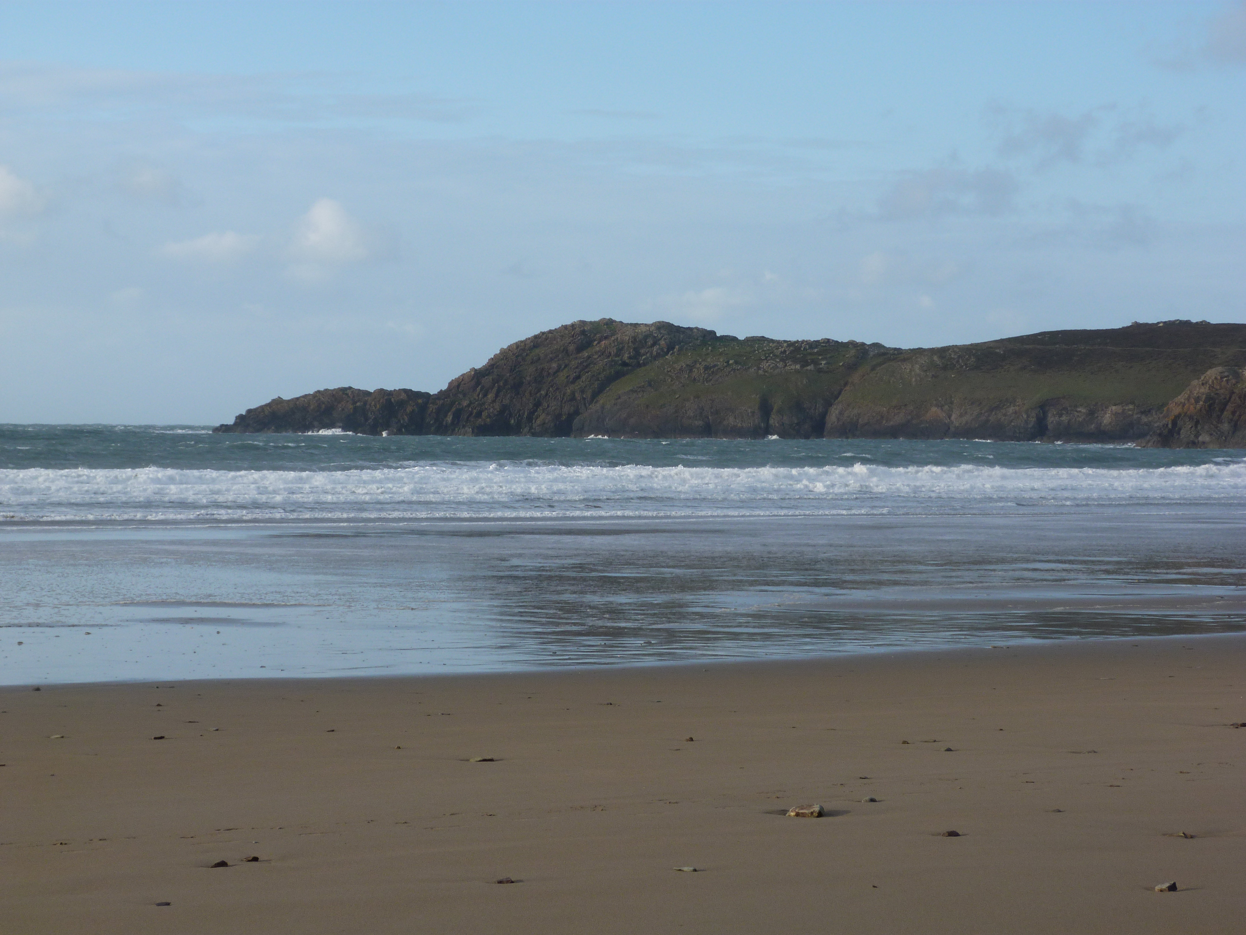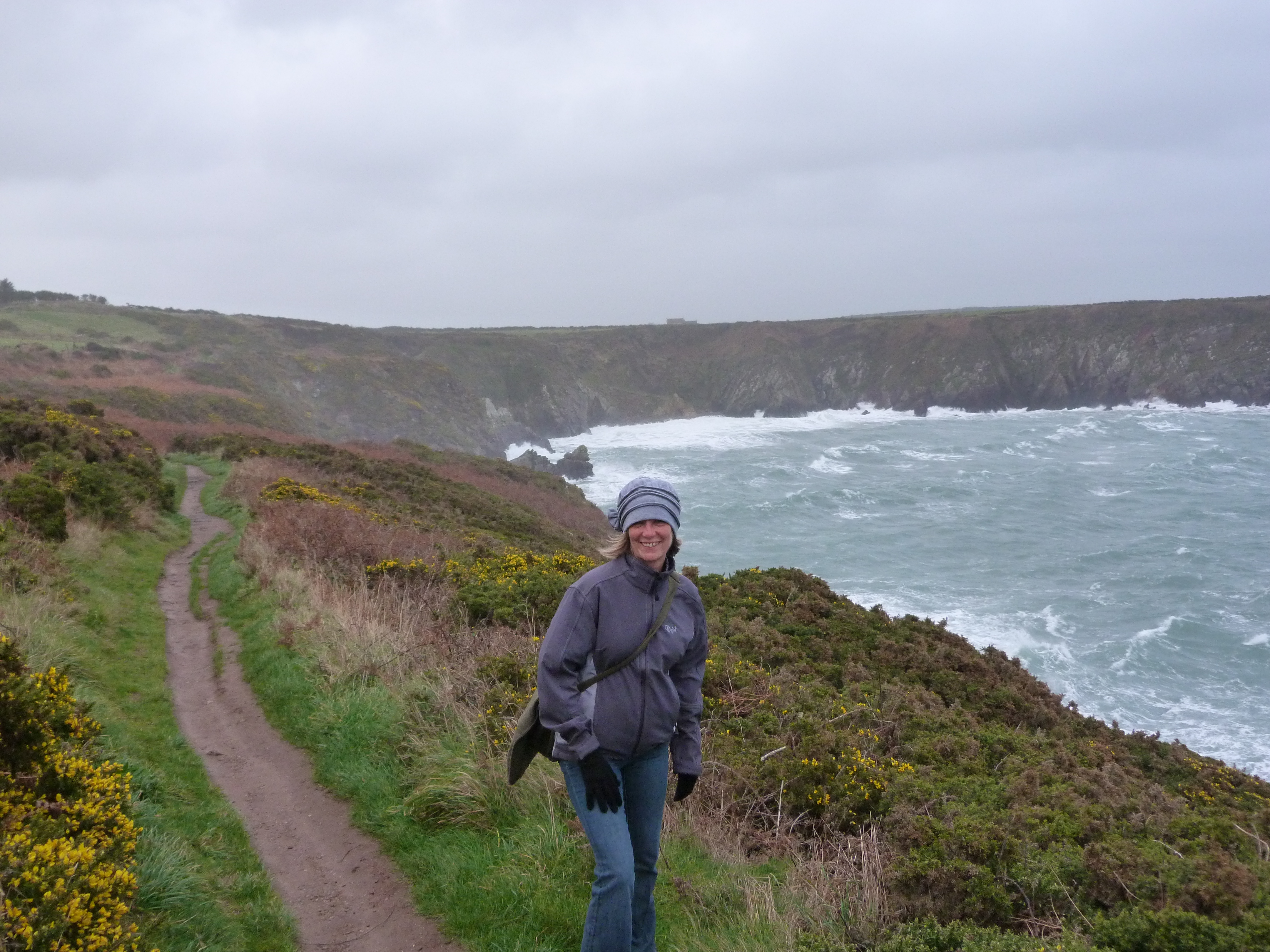 We were drenched when we walked into the Farmer’s Arms, but after a bowl of leek and potato soup and a pint of Double Dragon we were dry, and so was the weather. A bit of sun came out so we headed out of town again, about 3 miles out, to join up the path at Whitesands Bay.