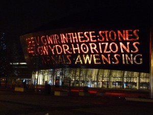 The bay has undergone massive renovation in the last few years. The focal point is the new Millennium Arts Centre,  a startling and massive arts complex dedicated to theatre, dance, opera and music. There was nothing on that we particularly wanted to see that day, although we were very tempted by Deffro’r Gwanwyn, the Welsh version of Spring Awakening. But it was amazing just to see the building, especially lit up in the dark of the night.