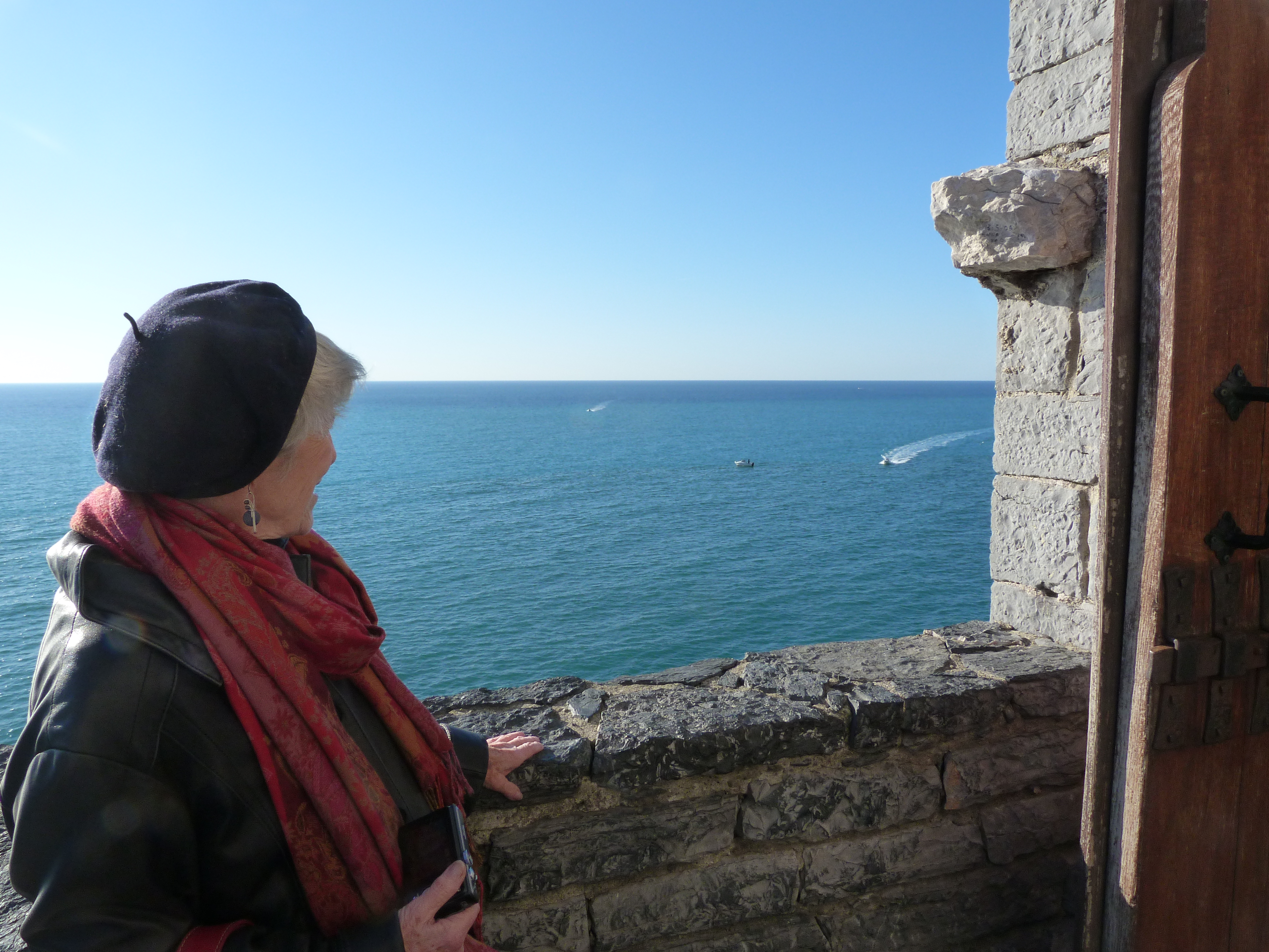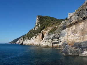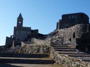 Traces of a Roman temple have been found here. The temple is thought to have been dedicated to Venus from which came the name “Portus Veneris” —  Porto Venere. Like most sacred places, successive generations have added and adapted according to needs, and so the Chiesa di San Pietro is a mixture of Romanesque and Gothic styles. Built of white and black marble in the Gothic-Genoese style, it sits right on the edge of the water. A “back door” leads out to a small stone platform overlooking the bay. A perfect sun trap.