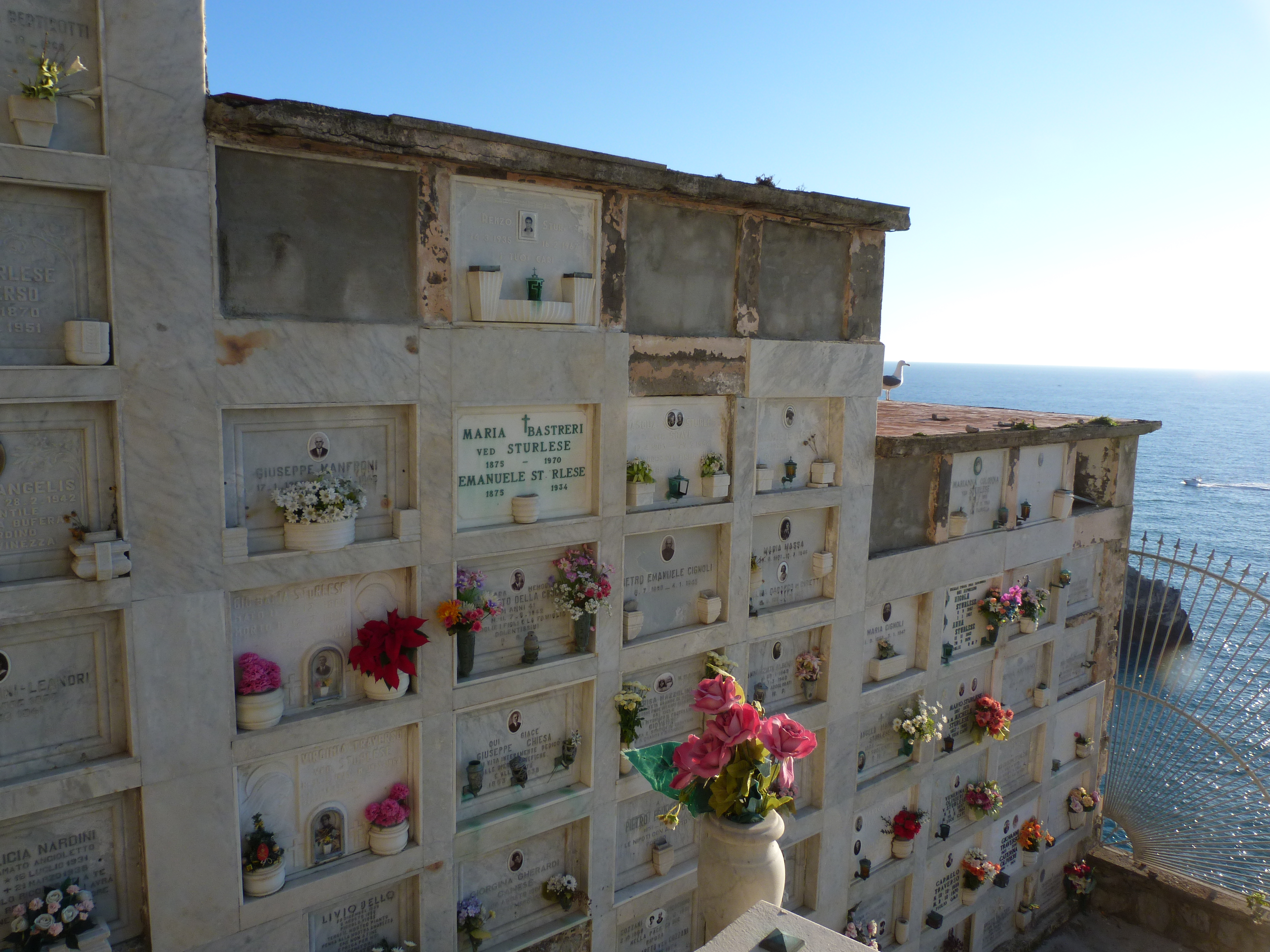 We walked higher, to the outer ramparts of the Castle, built in 1161. But rather than go in, Tim & I became distracted by a cemetery on the edge of the cliff below the castle. The cemetery has a few mausoleums, but the final resting places are mostly in marble walls facing the ocean. Apparently there is a rotational system – for the first generation after your death you get a fairly prominent position. Gradually, your remains are moved to one of the less accessible places. All in all, we think it is a lovely place to honour the memory of a loved one.
