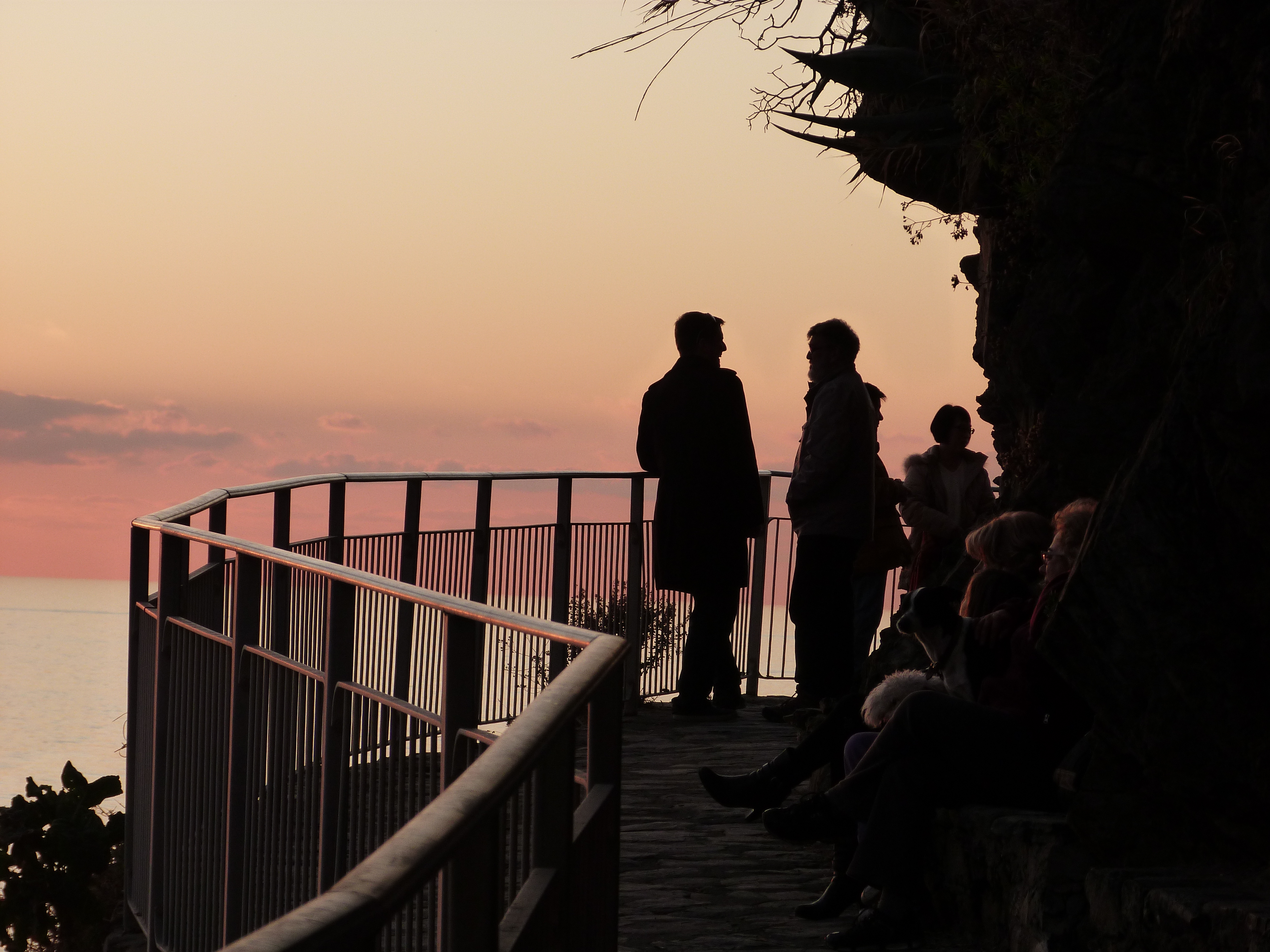 However, we didn’t bring picnics – we were there to sample local cuisine. We discovered the Enoteca Il Pirun, a wine bar and tiny restaurant that served us an amazing meal of pastas. Tim & I shared a plate of acciughe sotto limone (anchovies marinated in lemon and olive oil) that was one of the highlights of our visit. Sweet and lemony – we were eating fish caught directly outside the village with lemons grown on the trees in the village and olive oil made from olives grown on the surrounding terraces. How could it be better? We all shared around our different plates of pastas with mussels, clams, pesto and rolled away from the table late in the afternoon to take the 3-minute train ride to Manerola. From Manerola we walked into the sunset of Via Dell’Amore toward Riomaggiore. A couple of new lovers locks were added to the collection.