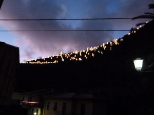 Just above the town, in the terraced vineyards above the houses, was a massive nativity scene. Figures of the nativity and of every day working people were lit up as the darkness set in. Apparently these are the work of a local resident, who sets up many different religious scenes as a tribute to his father.