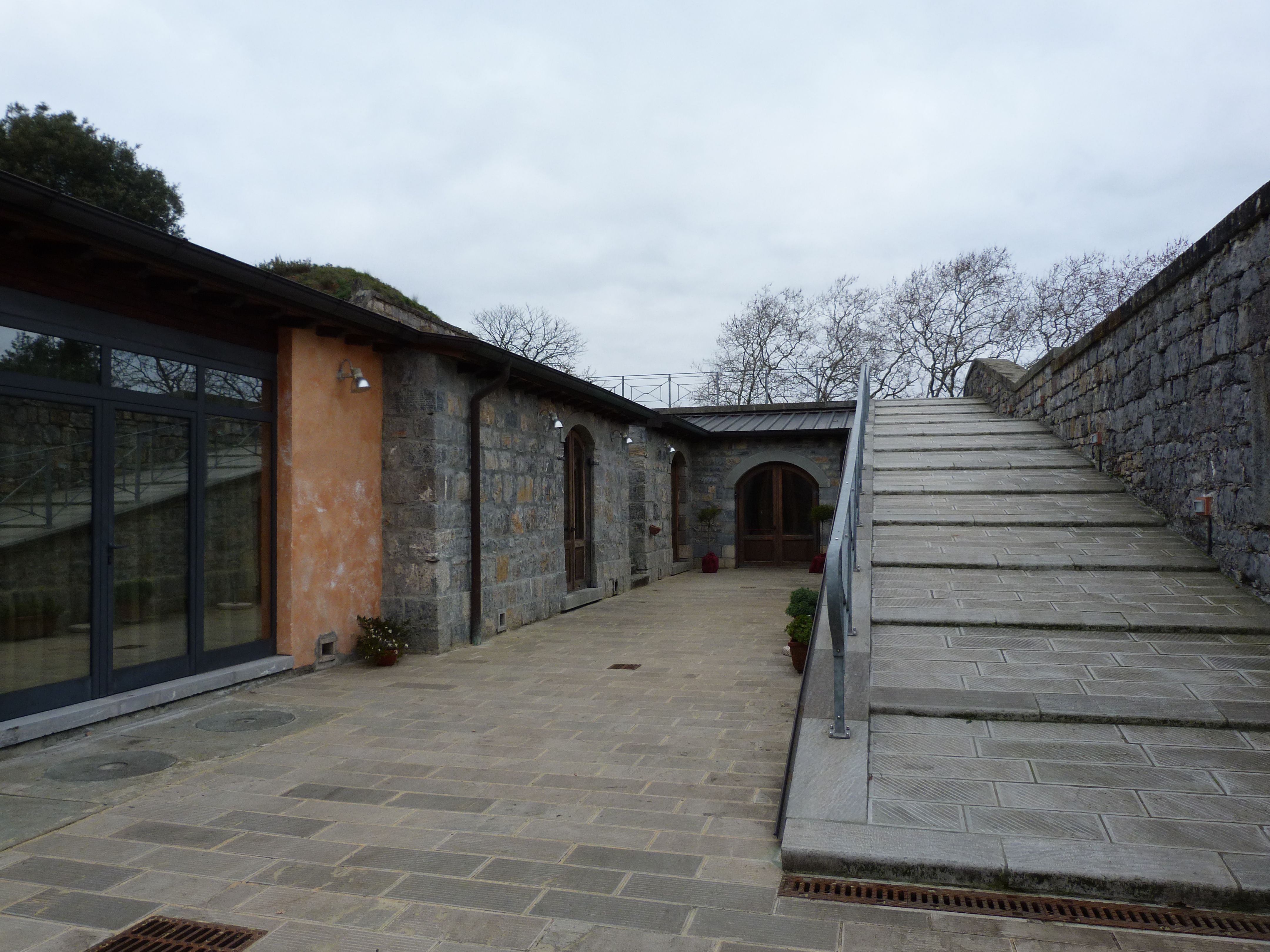 The day before New Year’s eve, Tim, my mother and I were driving the hills above the villa in search of a local restaurant. We were lost and cranky. The restaurant was nowhere in sight. But suddenly we saw a sign for Ristorante Forte Mace’. This was not what we were looking for, but we thought we should check it out. We drove up to what looked like a fortification, set deep into the ground, atop a hill. Which is exactly what it was.
