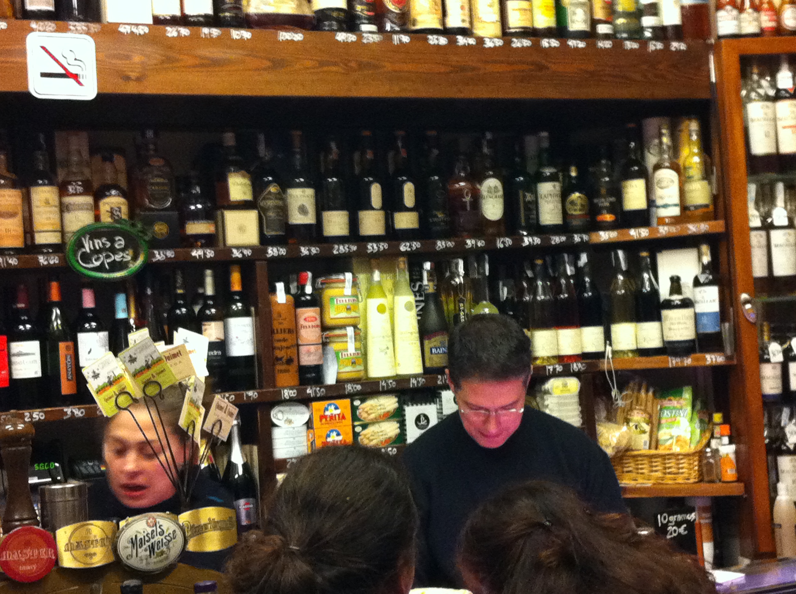 The minute we walked in, we felt a great sense of camaraderie. A tiny, one room space, Quimet & Quimet has been going since 1914 passing from one generation to the next and currently run by a brother and sister team. The small room is filled with bottles of wine and spirits floor to ceiling (some, perhaps, that have been there since the bodega opened). There is a long prep counter along one wall, where the owners were busily working.