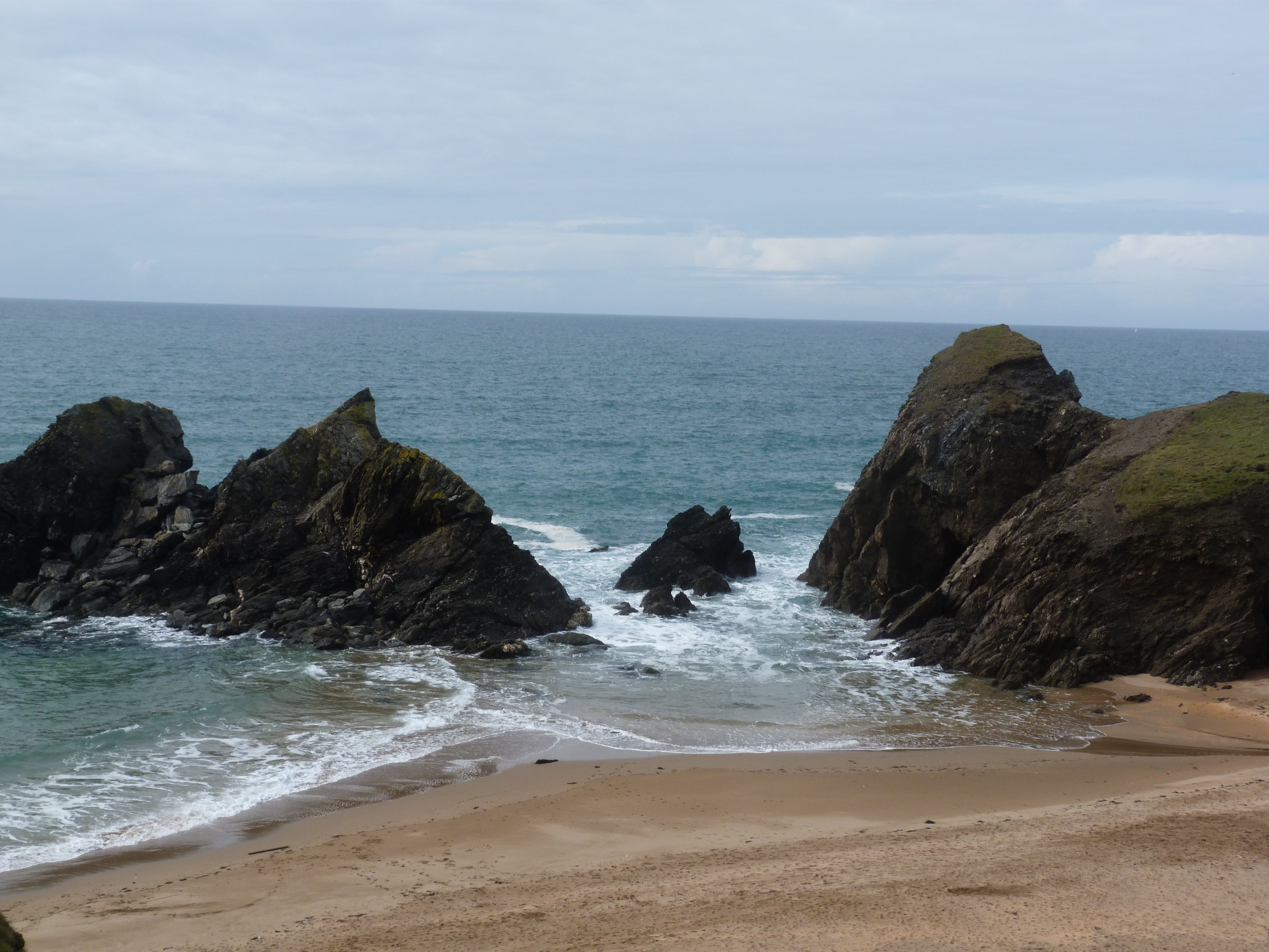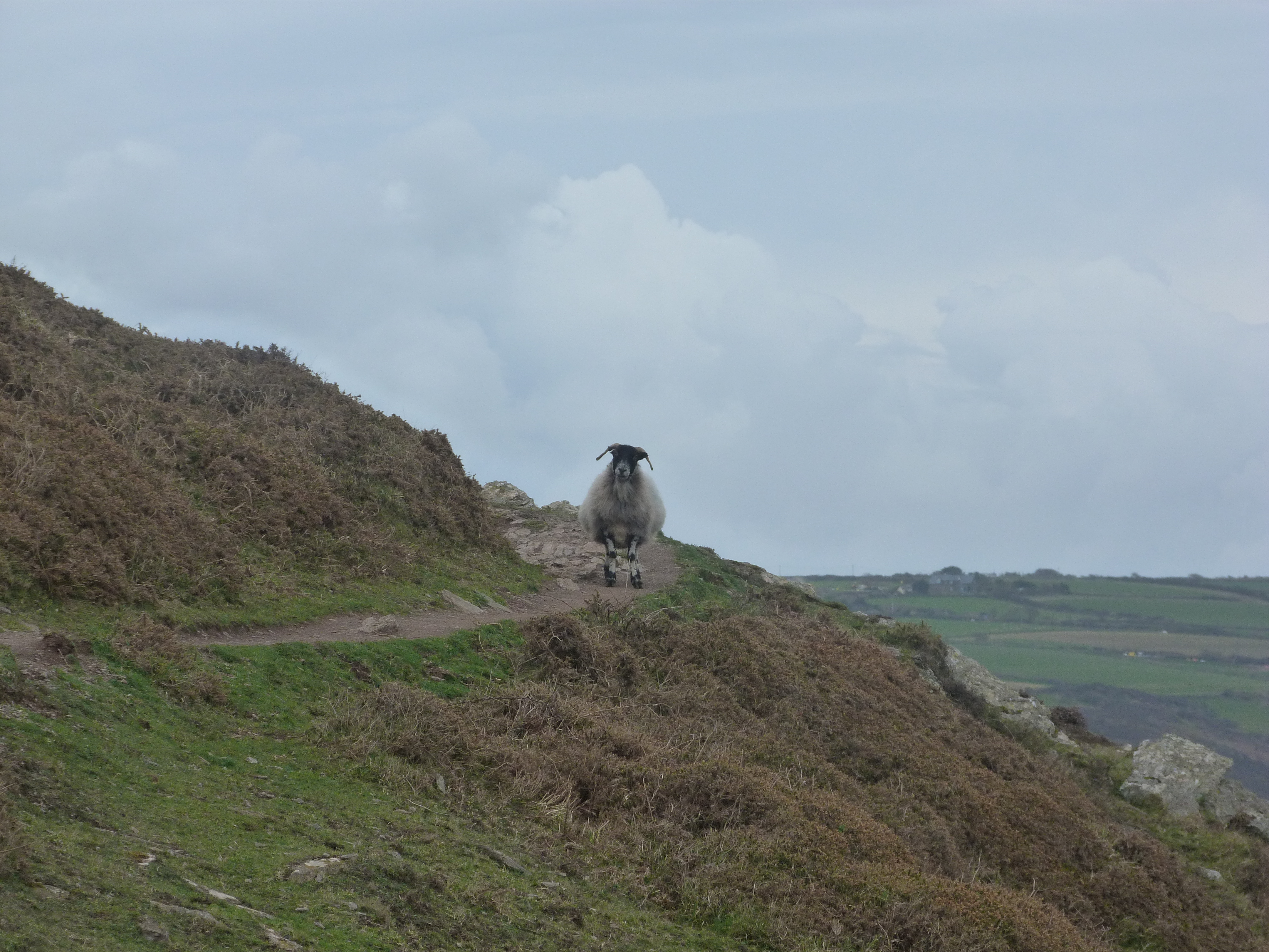 We rounded the corner, dodging sheep, to look down on the green blue waters of Starehole Bay and the dramatic rocks of Sharp Tor. These are “metamorphic rocks”, rocks that have changed their nature through pressure or heat. They are incredibly dramatic formations that look like they have been squeezed out of the earth and are ready to fall on unsuspecting hikers below.