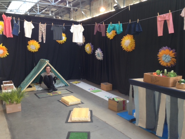 No sooner had Theatre Direct technician Dean put up the pipe and drape for our fabric garden walls, than Carys was there affixing the paper flowers, Michelle was making tape drawings on the floor, and Jessica was putting down blocks of bumpy foam and astro turf to make a sidewalk to lead to the tent.