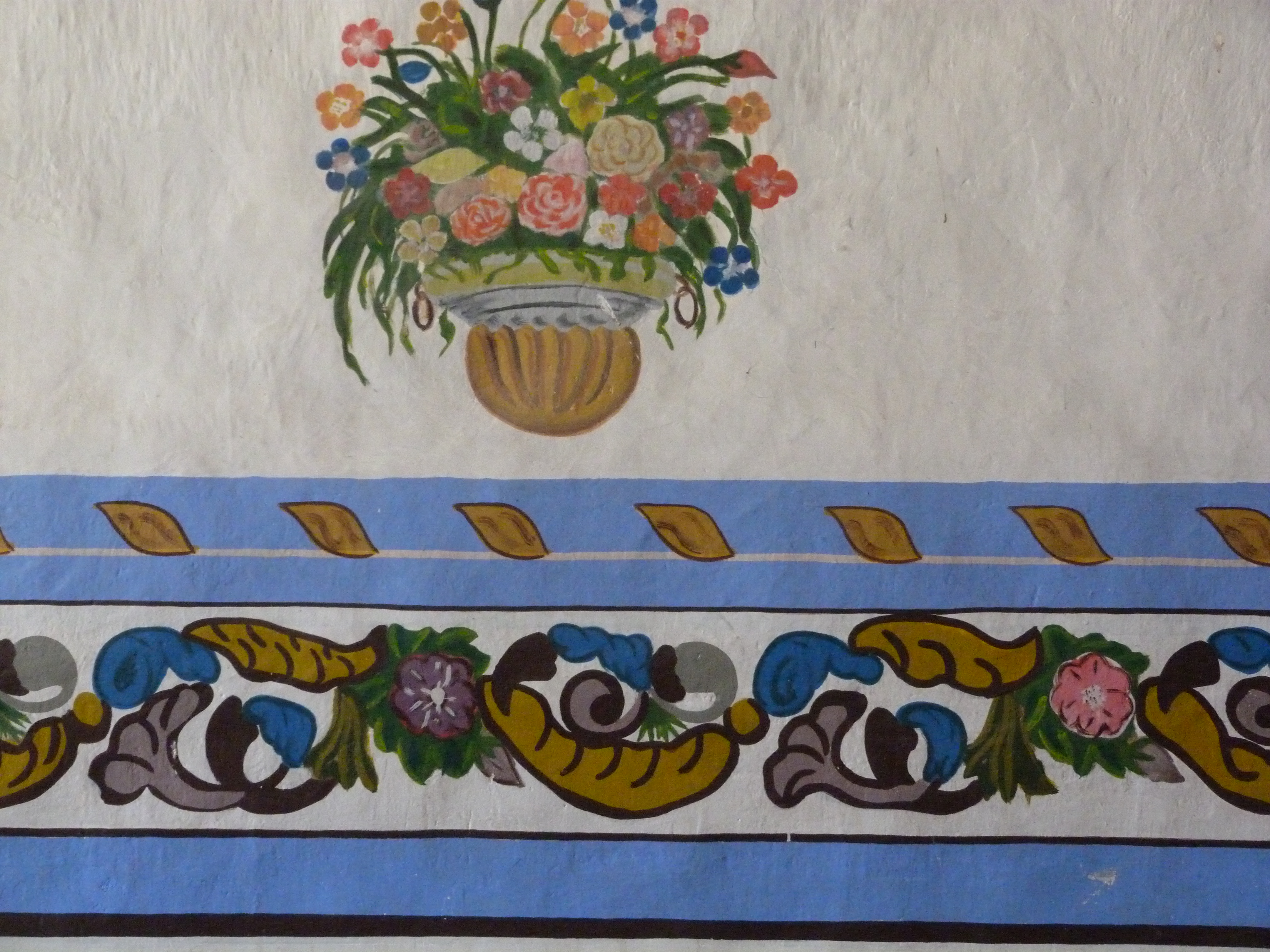 The chapel is a place of pilgrimage, where people go during Lent to be cured. The church is filled with painted decorations, simplification of 16th century “white vine illuminations” commonly seen in Spanish manuscripts of the time. Here, though, they seem to be painted from memory, from a vague sense of what they must have looked like in the old world.