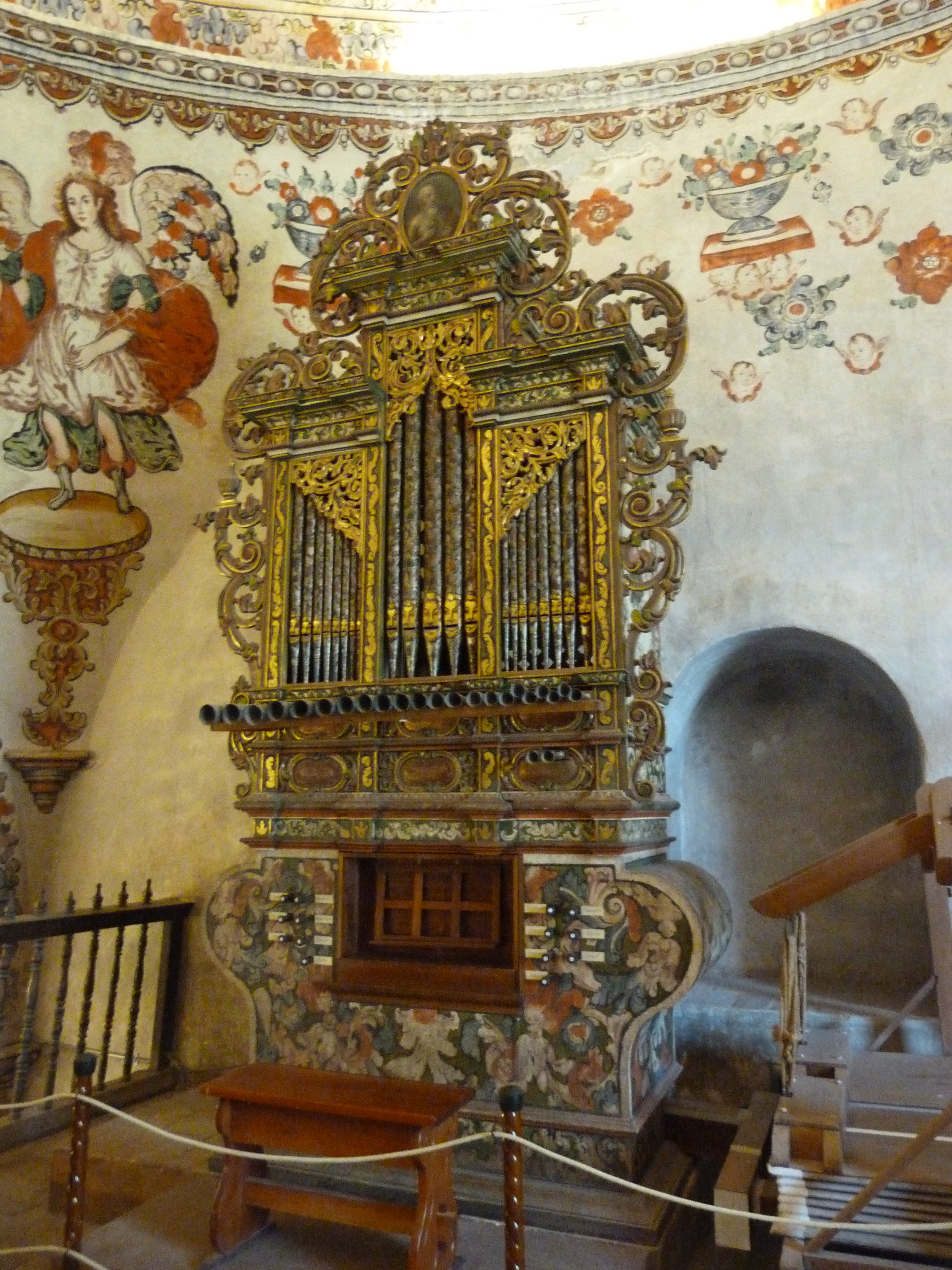 The organ is magnificent, covered in decoration, the pipes painted with wonderful faces and the stops hand lettered.