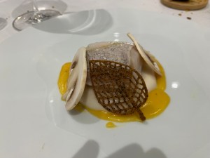 Marinated Hake with Setas and sauce. The delicate leaf was edible and crunchy. It tasted of truffle and spices.