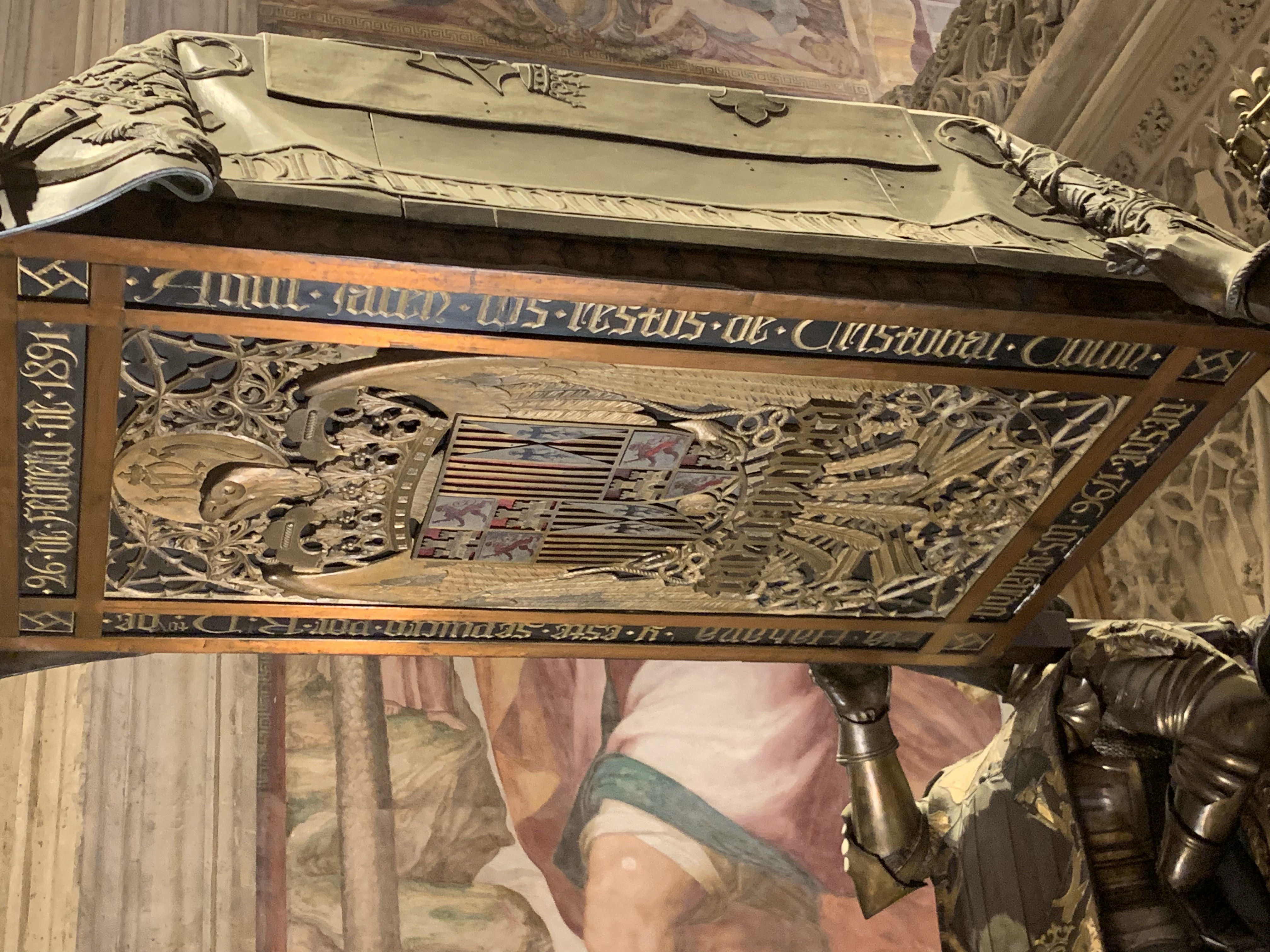 The base of the tomb of Christopher Columbus. A plaque tells you that his remains have been authenticated.