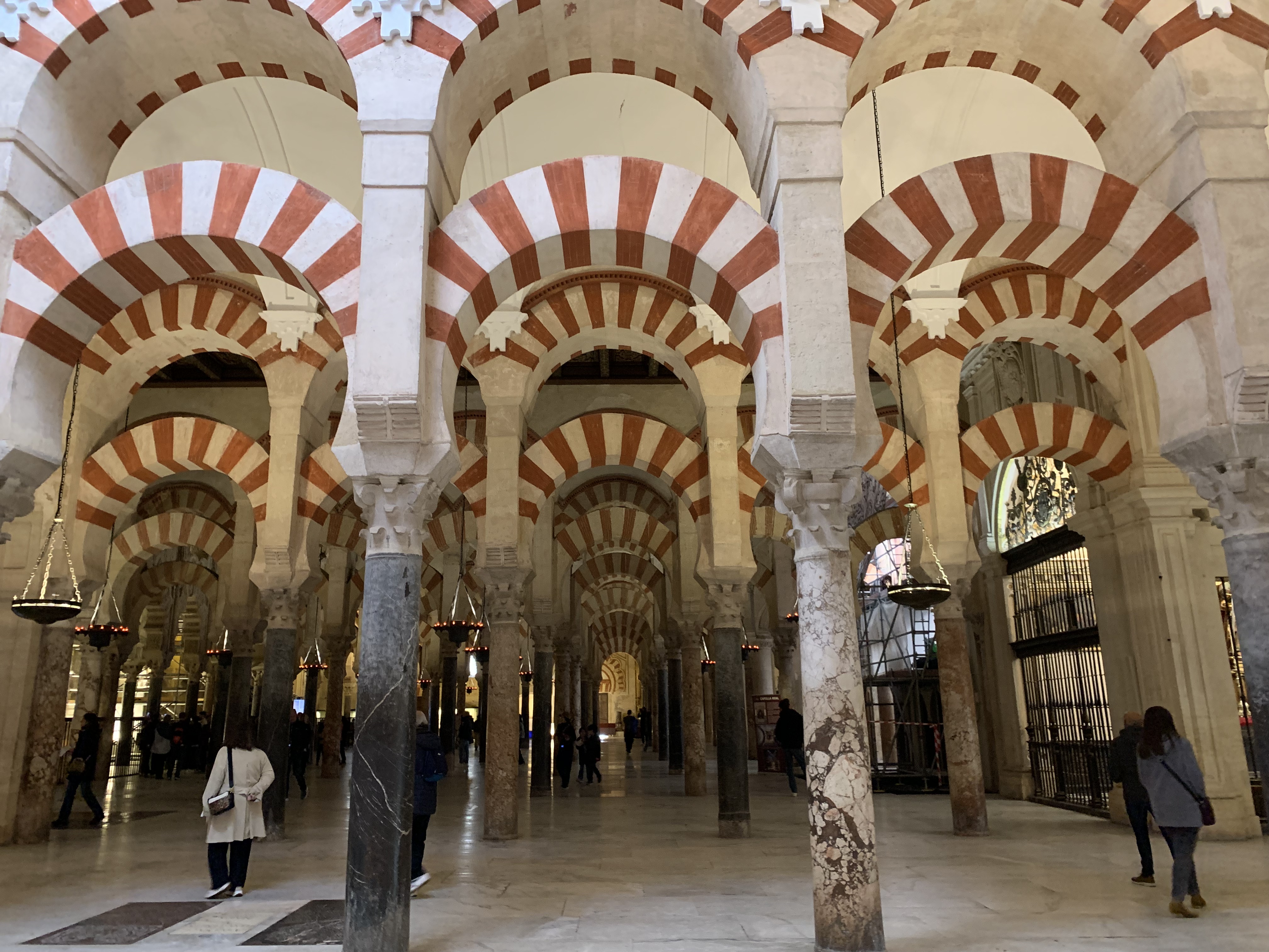 Inside La Mezquita, the mosque, with large red and white stone arches,