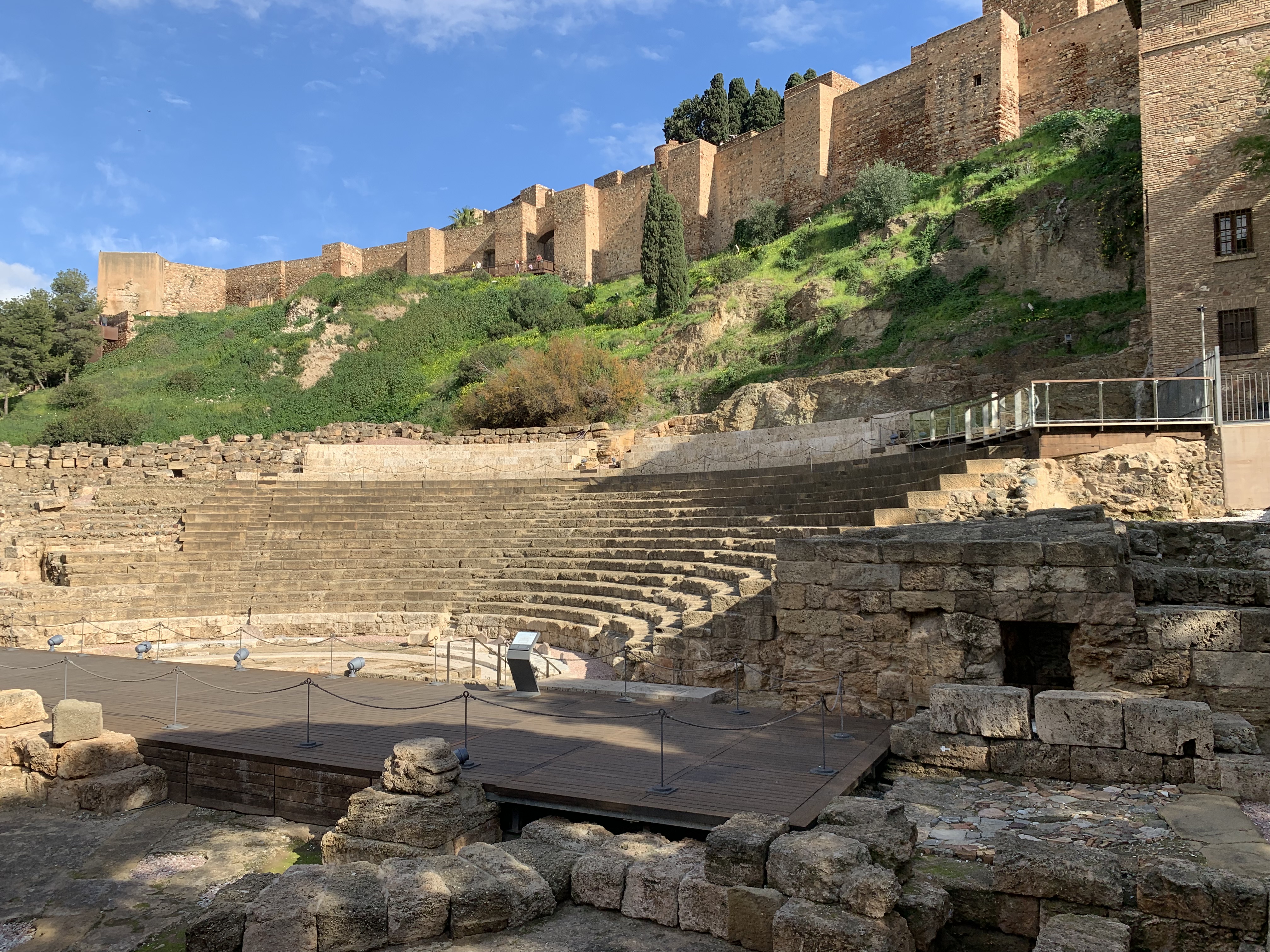 The Gibralfaro Castle (10th century ) overlooks the whole city from atop the Mount Gibralfaro. Beside it rests the Alcazaba, one of the largest Arab fortresses in Andalucia.  Below, a Roman amphitheatre dominates the square.